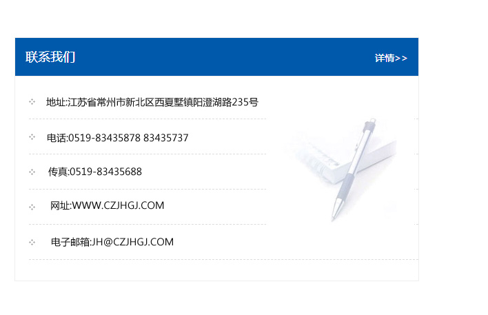 地址:常州市新北區友邦商務大廈1幢16、17層  電話:0519-85101652  傳真:0519-85112595  郵編:213022  網址:www.cz-jiayue_cn.yummysh.com  郵箱:xiajifengaa@163.com